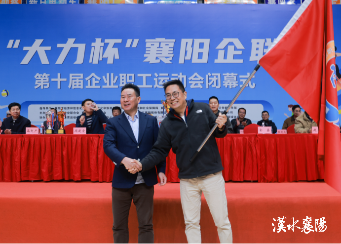 大力电工董事长高文广,将“襄阳企联职工运动会会旗”,移交给“第十一至十五届襄阳企联职工运动会”冠名单位东风康明斯发动机有限公司,东风康明斯总经理黄海涛接旗。东风康明斯是国内领先、国际一流的发动机制造企业,在体育运动中,也是国内一流。东风康明斯发动机有限公司总经理黄海涛介绍,东风康明斯长期关注员工的身心健康以及幸福感,公司从软硬件创造条件,让员工多锻炼,保证企业长期发展,让他们有比较好的这个精神状态、好的体魄投入工作,这也是他们冠名活动的初衷,相信未来五年“东风康明斯杯”襄阳企联职工运动会更加精彩。