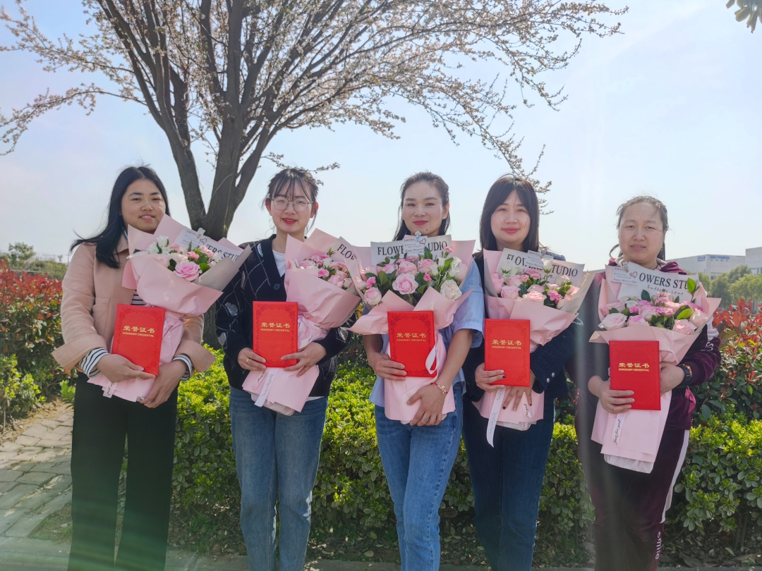 在三八节来临之际,公司工会组织开展了“三·八红旗手”评选活动,由各部门推选至各分会初选,并经工会委员会综合审议,最终评选出七位“三·八”红旗手,分别为:生产岗田莉、刘思;管理岗马雪洁、王皎;技术岗朱俊兰;销售岗王亚雪;后勤岗陈小雨。她们是广大女性职工的优秀代表,在各自的工作岗位上尽心尽责,爱岗敬业,展示了我公司优秀女员工的风采和精神面貌,在员工中树立了好的榜样。大力电工党委书记余志金、工会主席张继宏、软起事业部总经理任卫红对获奖个人颁发了荣誉证书和奖品。